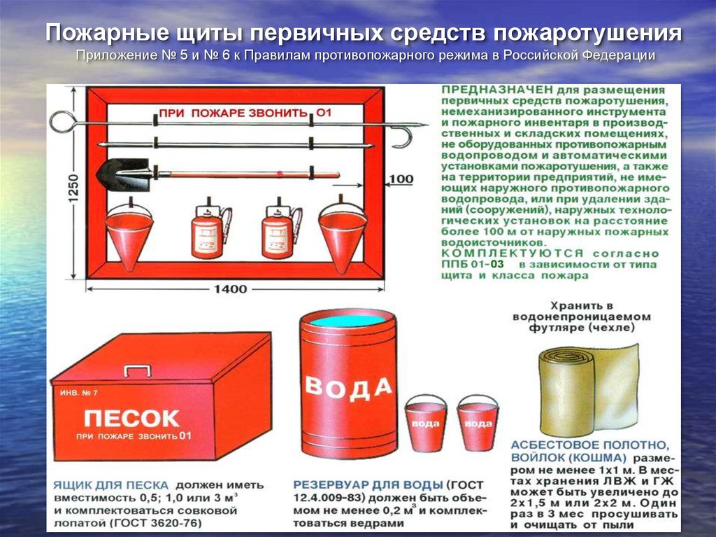 Пожарные щиты первичных средств пожаротушенияПриложение № 5 и № 6 к Правилам противопожарного режима в Российской Федерации