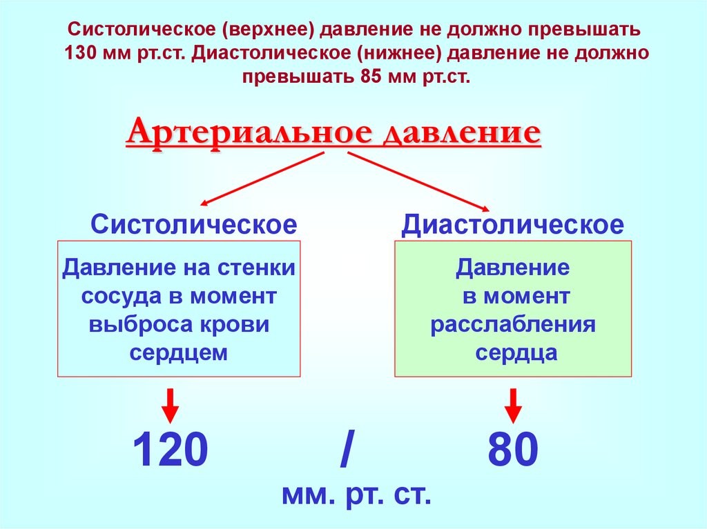 Систолическое (верхнее) давление не должно превышать130 мм рт.ст. Диастолическое (нижнее) давление не должно