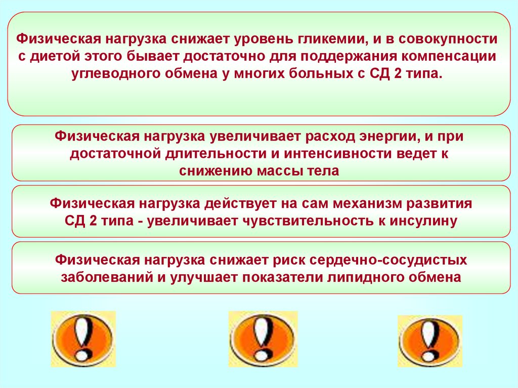 Физическая нагрузка снижает уровень гликемии, и в совокупностис диетой этого бывает достаточно для поддержания компенсации