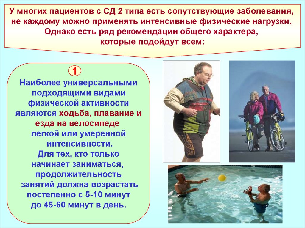У многих пациентов с СД 2 типа есть сопутствующие заболевания,не каждому можно применять интенсивные физические нагрузки.