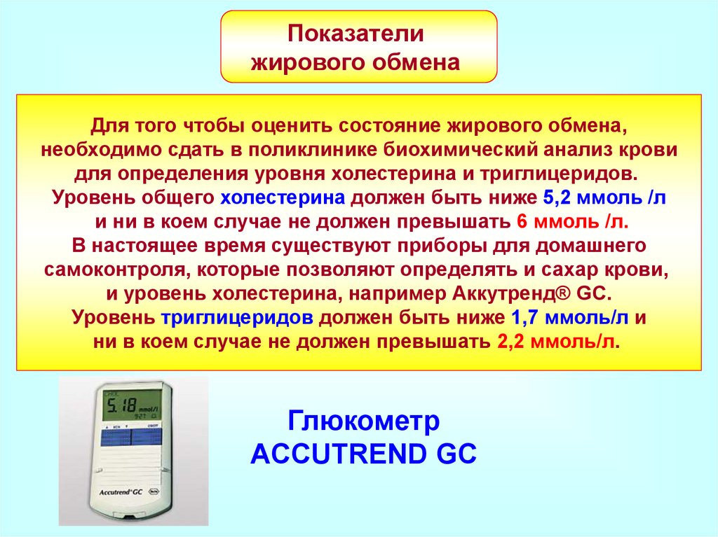 Уровень общего холестерина должен быть ниже 5,2 ммоль /л
