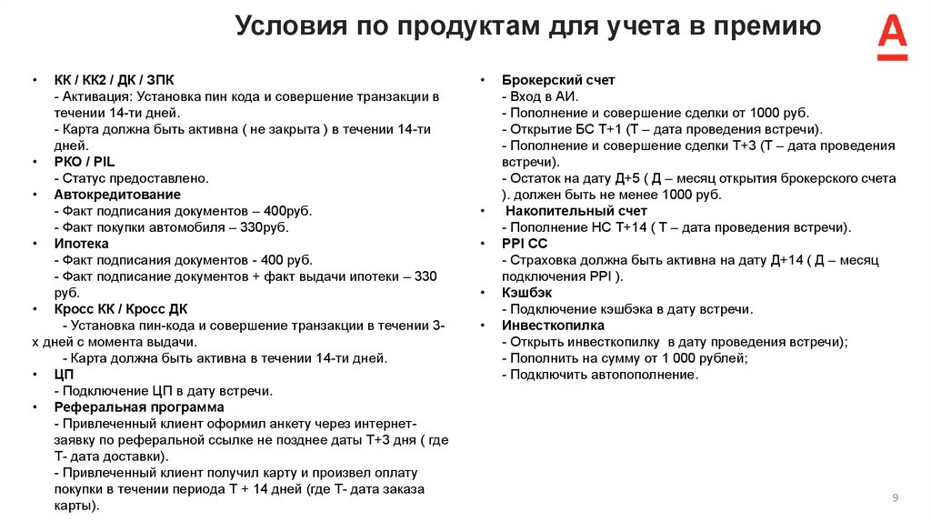 Условия по продуктам для учета в премиюКК / КК2 / ДК / ЗПК