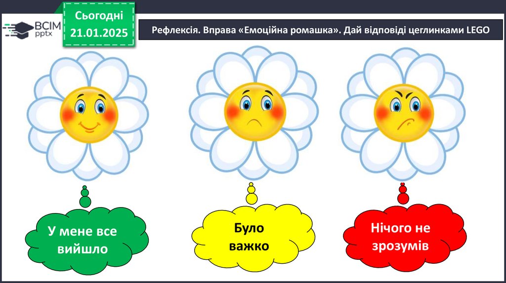 Рефлексія. Вправа «Емоційна ромашка». Дай відповіді цеглинками LEGO