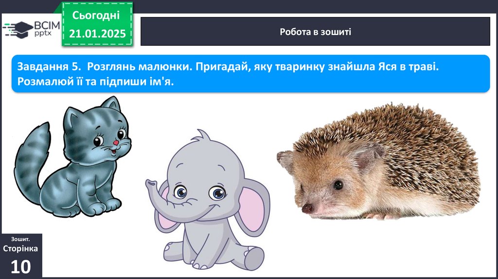 Завдання 5. Розглянь малюнки. Пригадай, яку тваринку знайшла Яся в траві.
