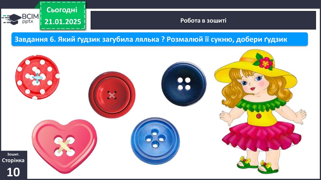 Завдання 6. Який ґудзик загубила лялька ? Розмалюй її сукню, добери ґудзик