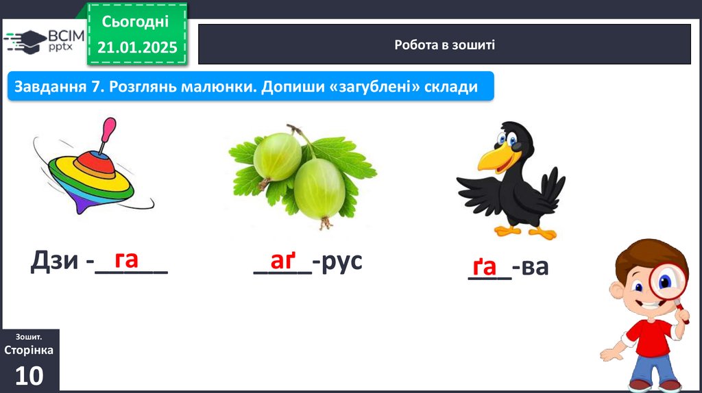 Завдання 7. Розглянь малюнки. Допиши «загублені» склади