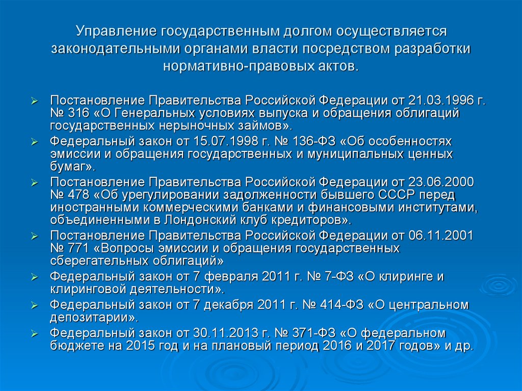 18. Управление государственным долгом осуществляется законодательными органами власти посредством разработки нормативно-правовых