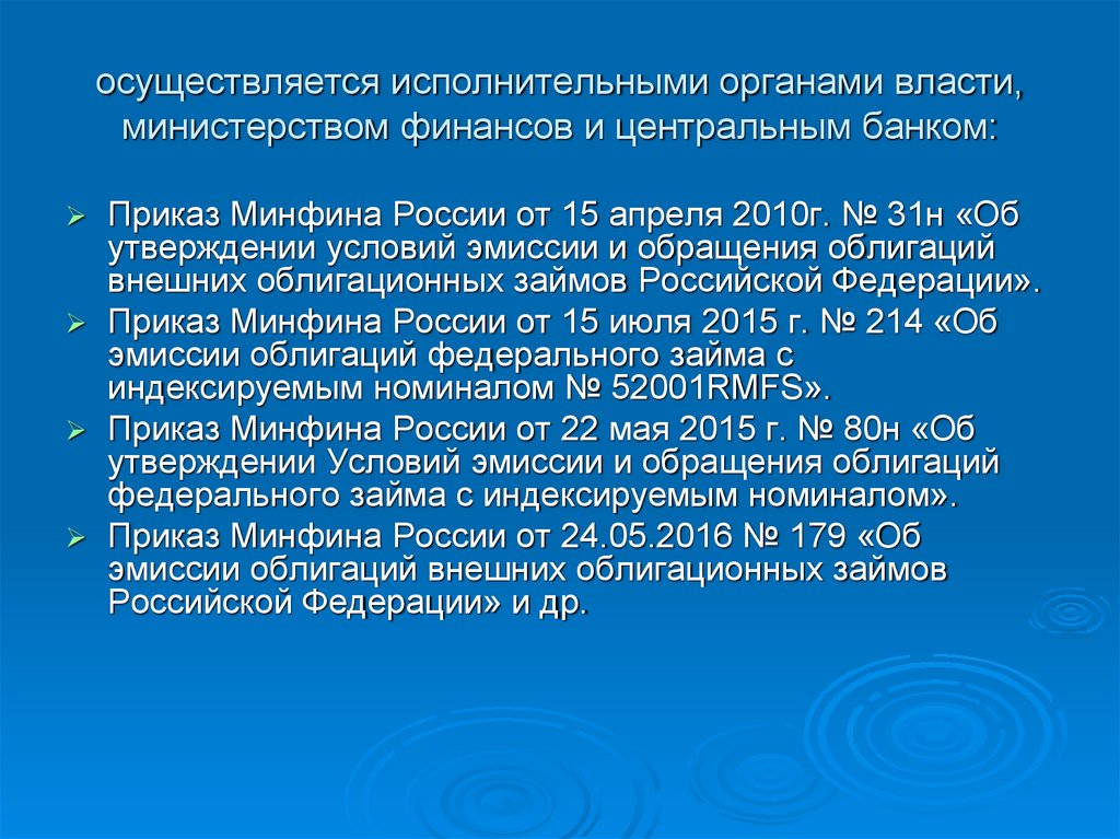 Приказ Минфина России от 15 апреля 2010г. № 31н «Обутверждении условий эмиссии и обращения облигаций