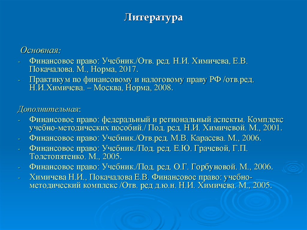 - Химичева Н.И., Покачалова Е.В. Финансовое право: учебнометодический комплекс /Отв. ред д.ю.н. Н.И. Химичева. М., 2005.
