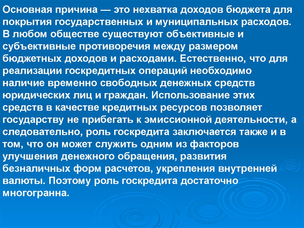 Основная причина — это нехватка доходов бюджета дляпокрытия государственных и муниципальных расходов.
