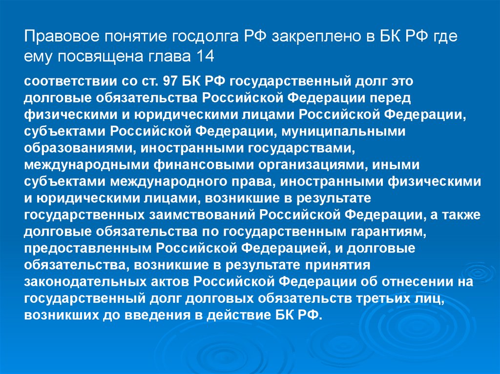 Правовое понятие госдолга РФ закреплено в БК РФ гдеему посвящена глава 14