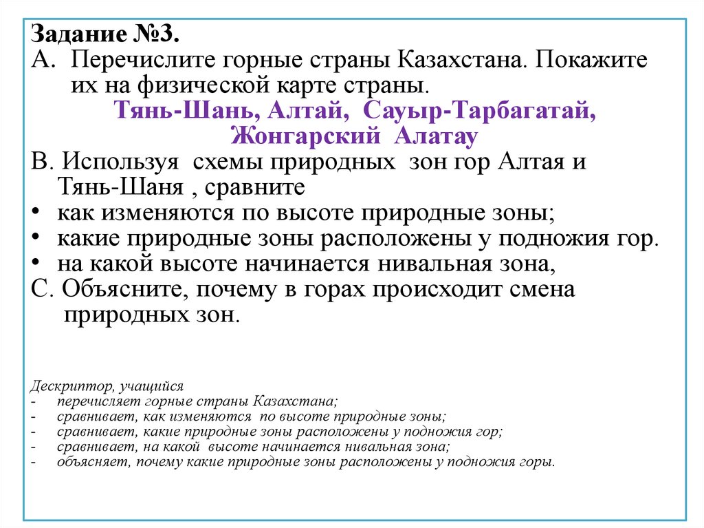 Задание №3.A. Перечислите горные страны Казахстана. Покажите