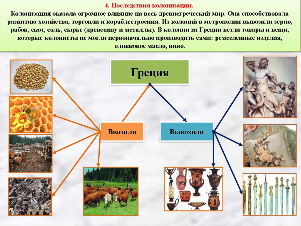 рабов, скот, соль, сырье (древесину и металлы). В колонии из Греции везли товары и вещи,