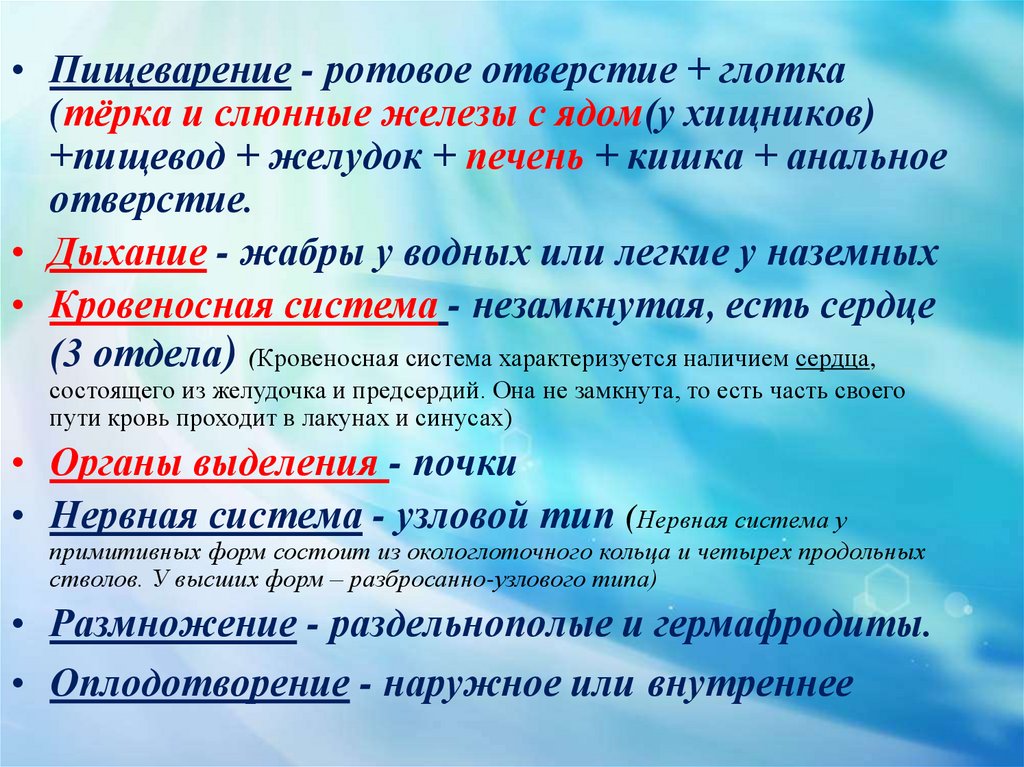 • Пищеварение - ротовое отверстие + глотка(тёрка и слюнные железы с ядом(у хищников)