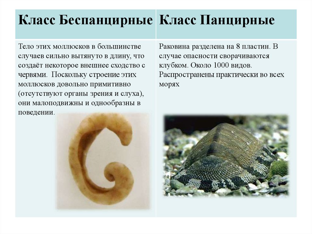 Класс Беспанцирные Класс ПанцирныеТело этих моллюсков в большинстве