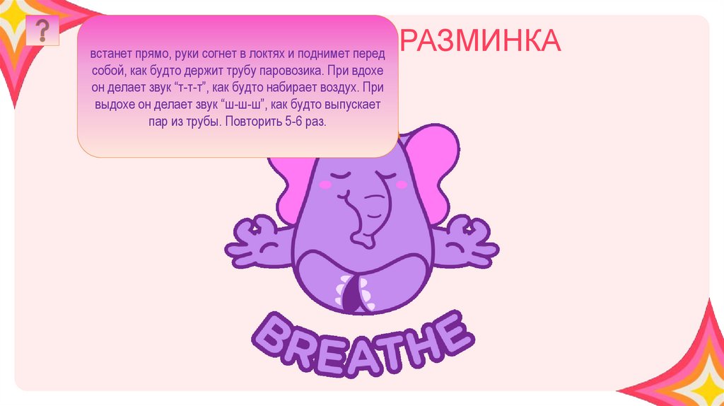 ДЫХАТЕЛЬНАЯ РАЗМИНКАвстанет прямо, руки опустит вдоль тела. При вдохе он