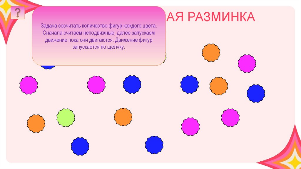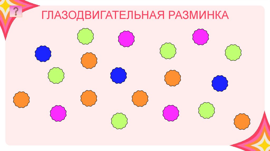ГЛАЗОДВИГАТЕЛЬНАЯ РАЗМИНКАЗадача сосчитать количество фигур каждого цвета.