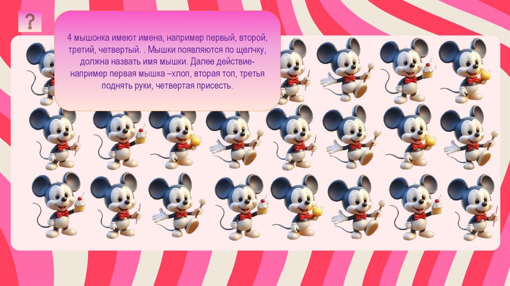 4 мышонка имеют имена, например первый, второй,третий, четвертый. . Мышки появляются по щелчку,