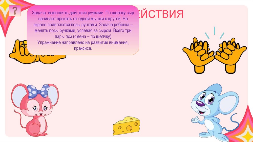 ВЫПОЛНИ ДЕЙСТВИЯЗадача выполнять действия ручками. По щелчку сыр
