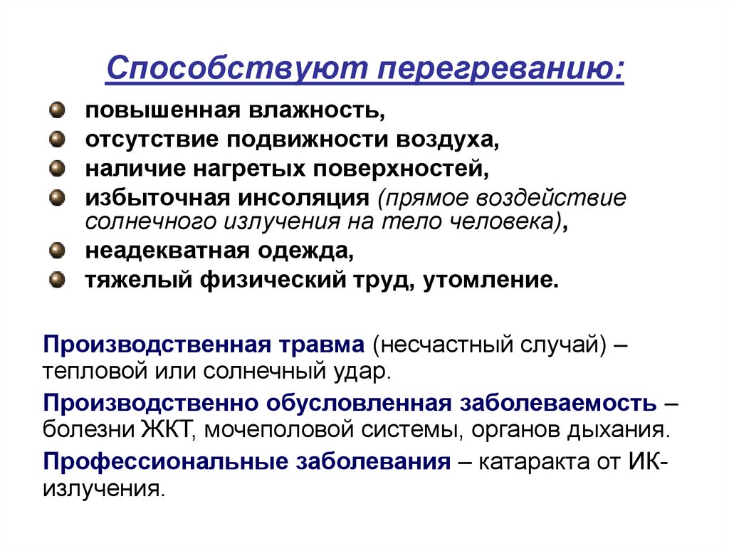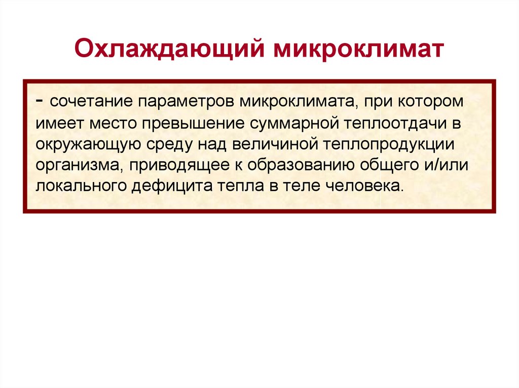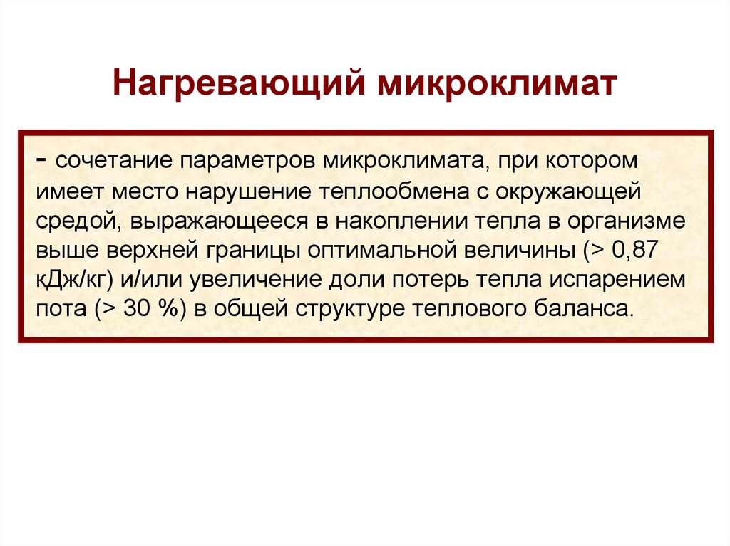 - сочетание параметров микроклимата, при которомимеет место превышение суммарной теплоотдачи в