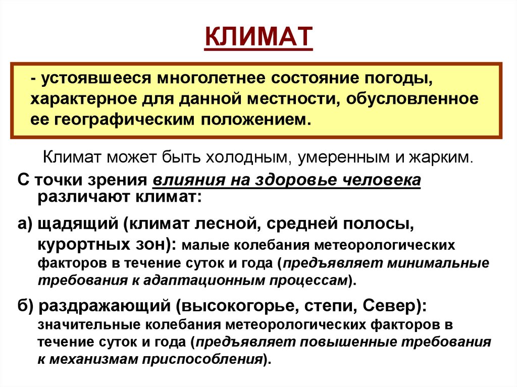 - устоявшееся многолетнее состояние погоды,характерное для данной местности, обусловленное