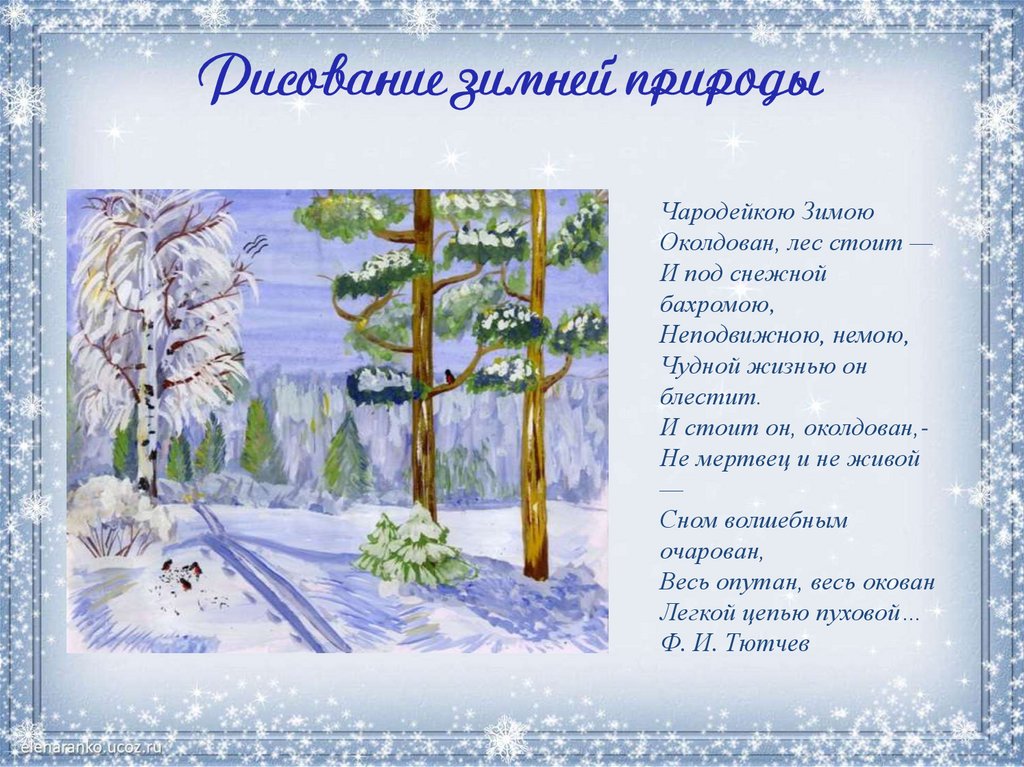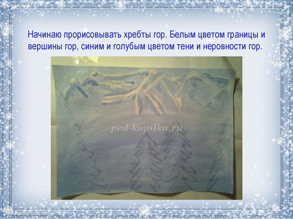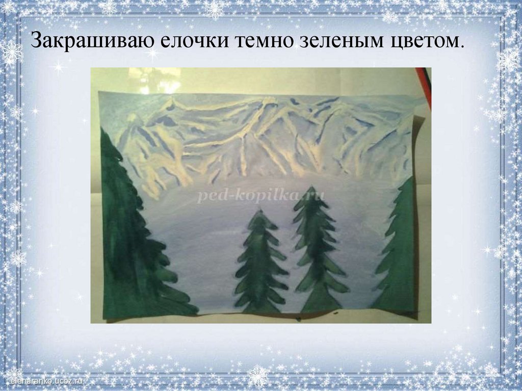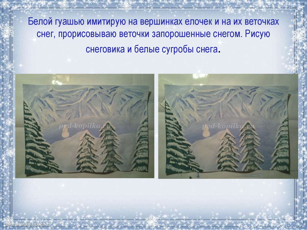 Белой гуашью имитирую на вершинках елочек и на их веточкахснег, прорисовываю веточки запорошенные снегом. Рисую