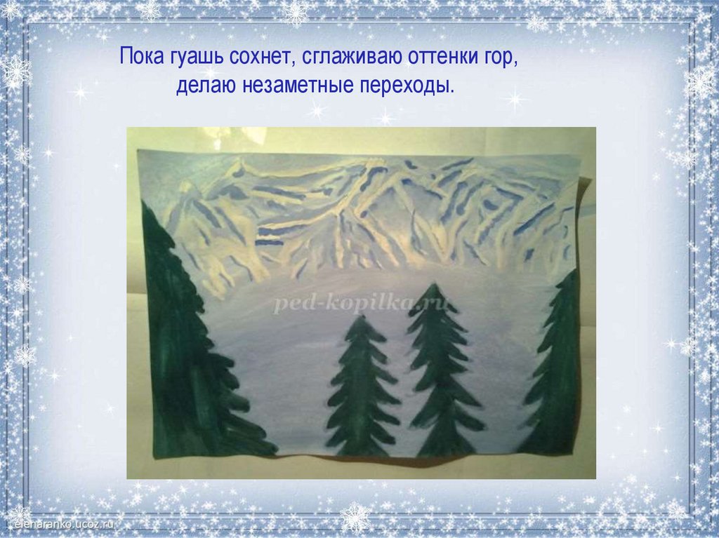 Пока гуашь сохнет, сглаживаю оттенки гор,делаю незаметные переходы.