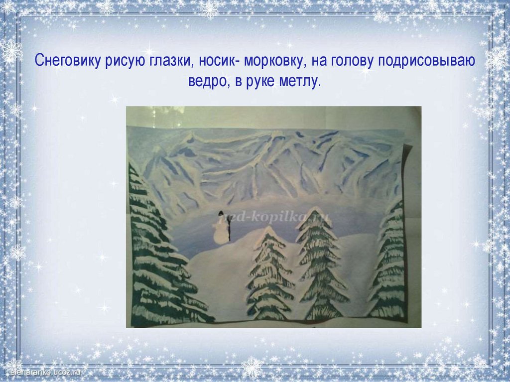 Снеговику рисую глазки, носик- морковку, на голову подрисовываюведро, в руке метлу.