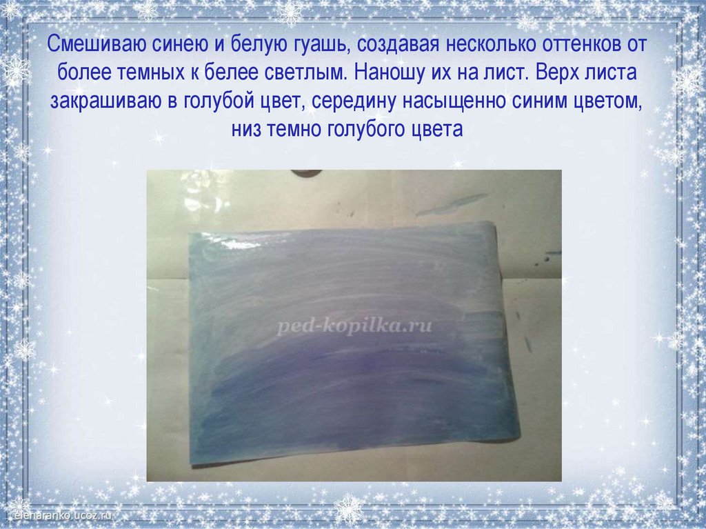 Смешиваю синею и белую гуашь, создавая несколько оттенков отболее темных к белее светлым. Наношу их на лист. Верх листа