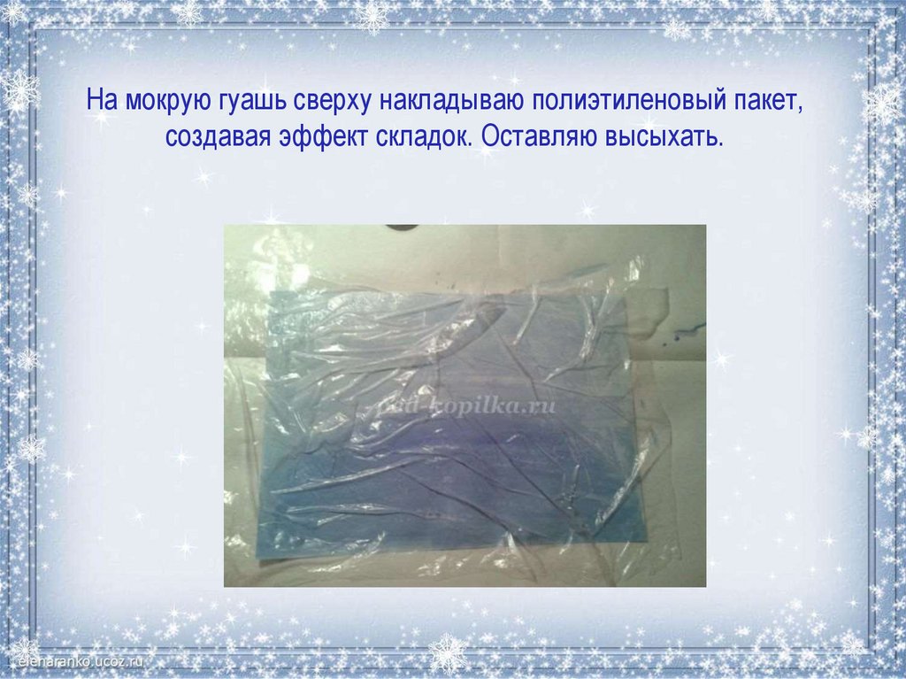 На мокрую гуашь сверху накладываю полиэтиленовый пакет,создавая эффект складок. Оставляю высыхать.