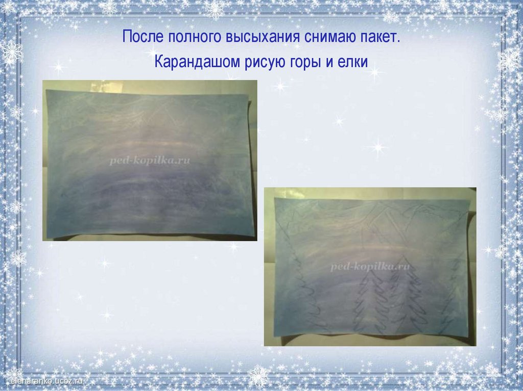 После полного высыхания снимаю пакет.Карандашом рисую горы и елки