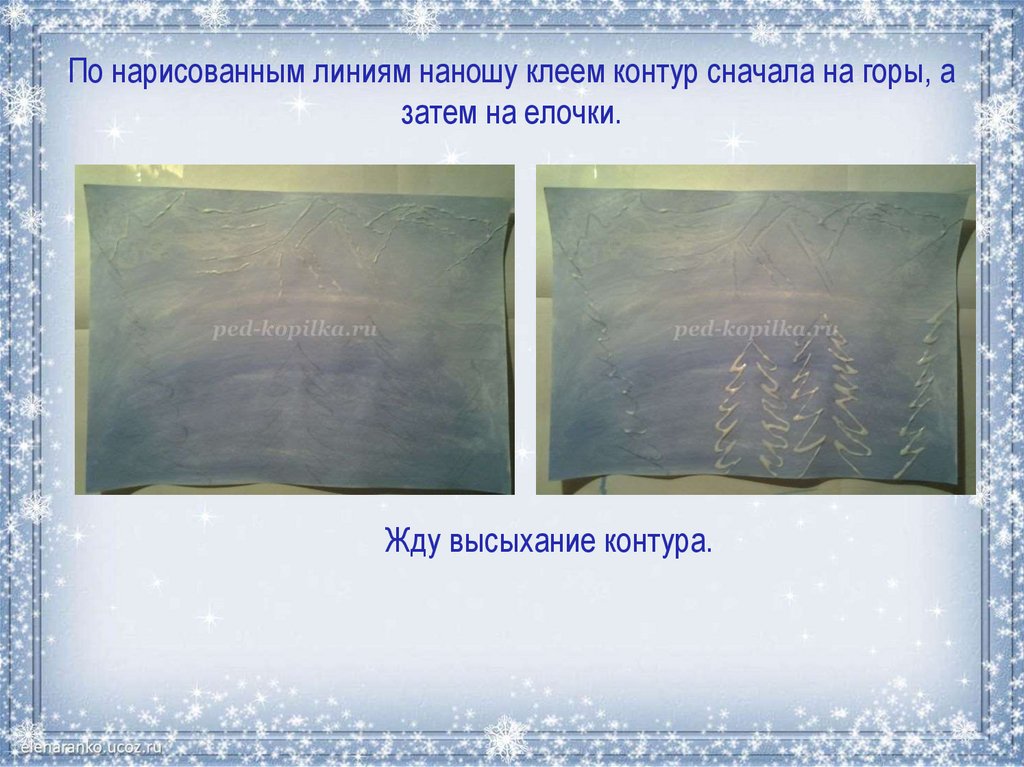 По нарисованным линиям наношу клеем контур сначала на горы, азатем на елочки.