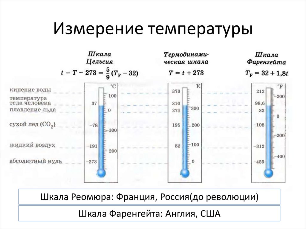 Шкала Реомюра: Франция, Россия(до революции)Шкала Фаренгейта: Англия, США
