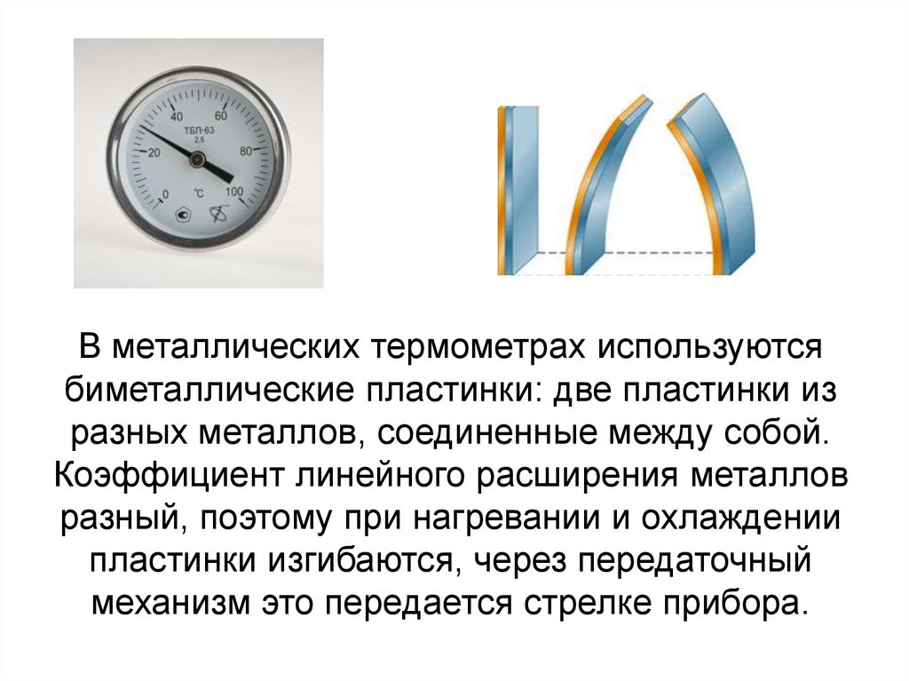 В металлических термометрах используютсябиметаллические пластинки: две пластинки из