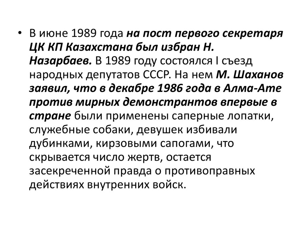 • В июне 1989 года на пост первого секретаряЦК КП Казахстана был избран Н.