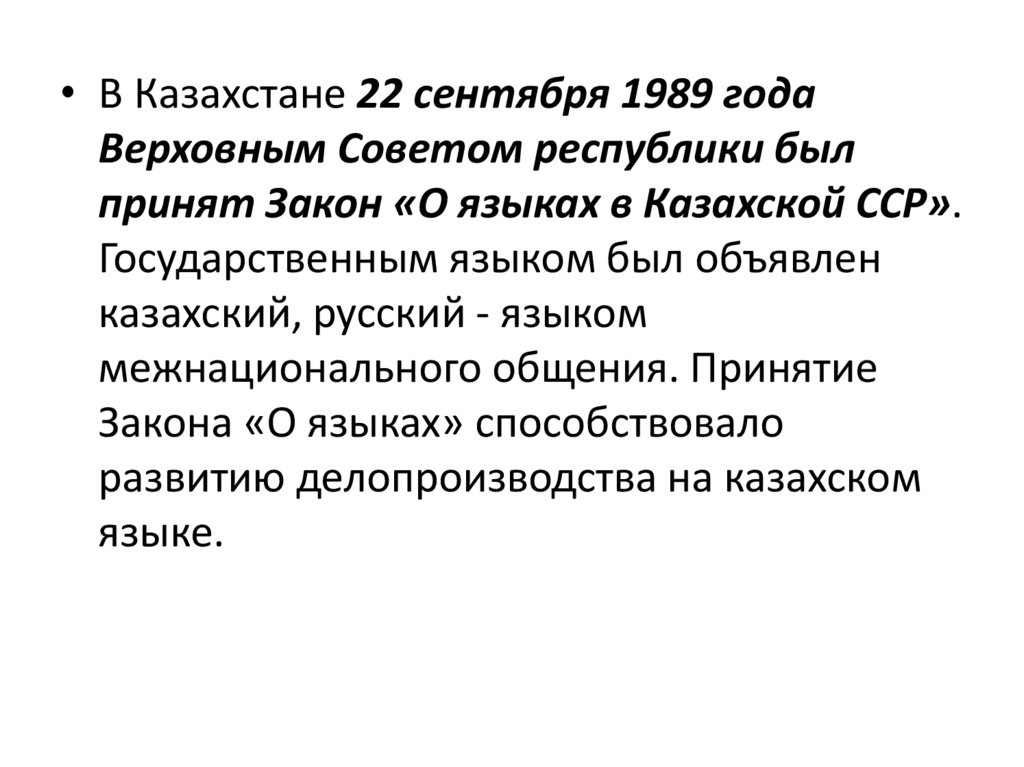 • В Казахстане 22 сентября 1989 годаВерховным Советом республики был