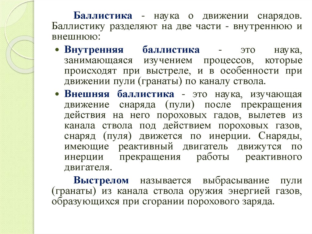 Баллистика - наука о движении снарядов.Баллистику разделяют на две части - внутреннюю и