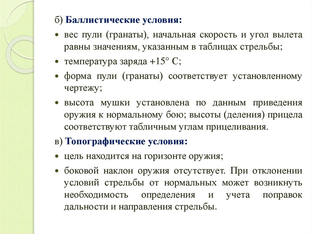 б) Баллистические условия:вес пули (гранаты), начальная скорость и угол вылета