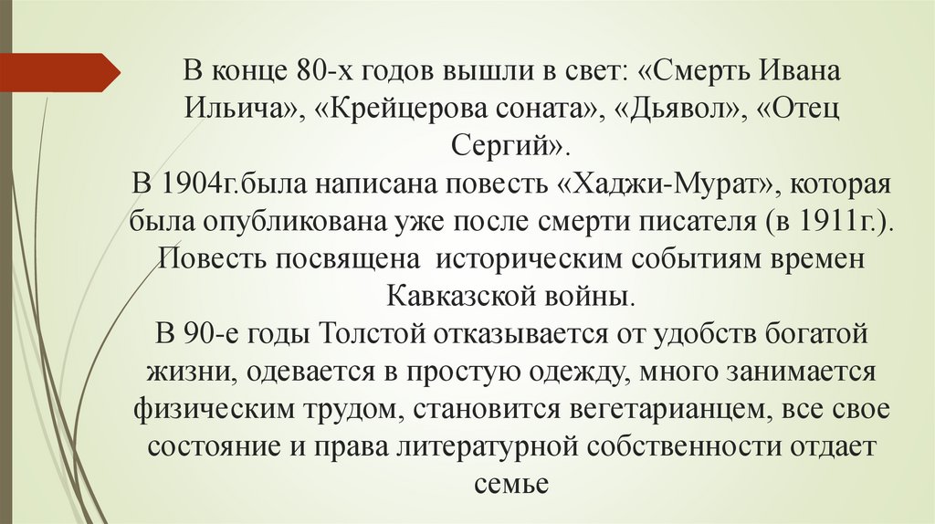 В конце 80-х годов вышли в свет: «Смерть ИванаИльича», «Крейцерова соната», «Дьявол», «Отец