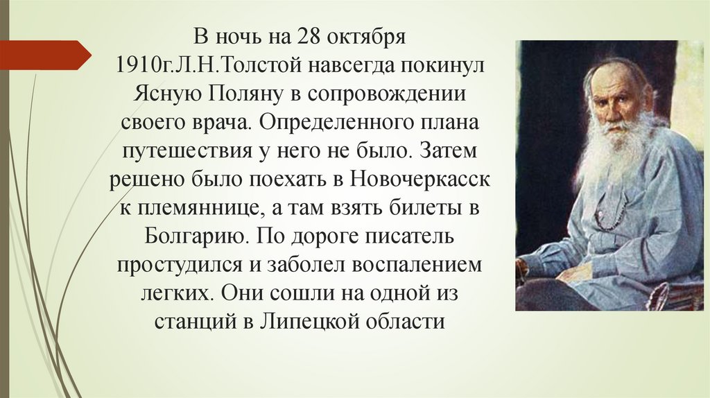 В ночь на 28 октября1910г.Л.Н.Толстой навсегда покинул