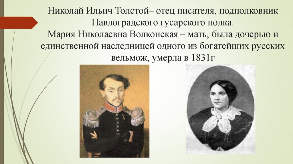 Николай Ильич Толстой– отец писателя, подполковникПавлоградского гусарского полка.