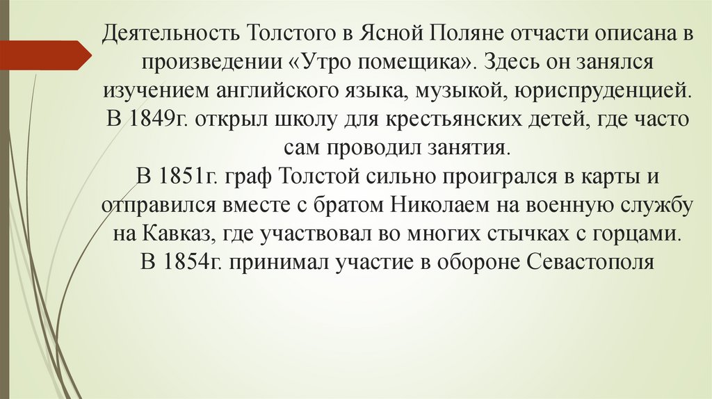 Деятельность Толстого в Ясной Поляне отчасти описана впроизведении «Утро помещика». Здесь он занялся