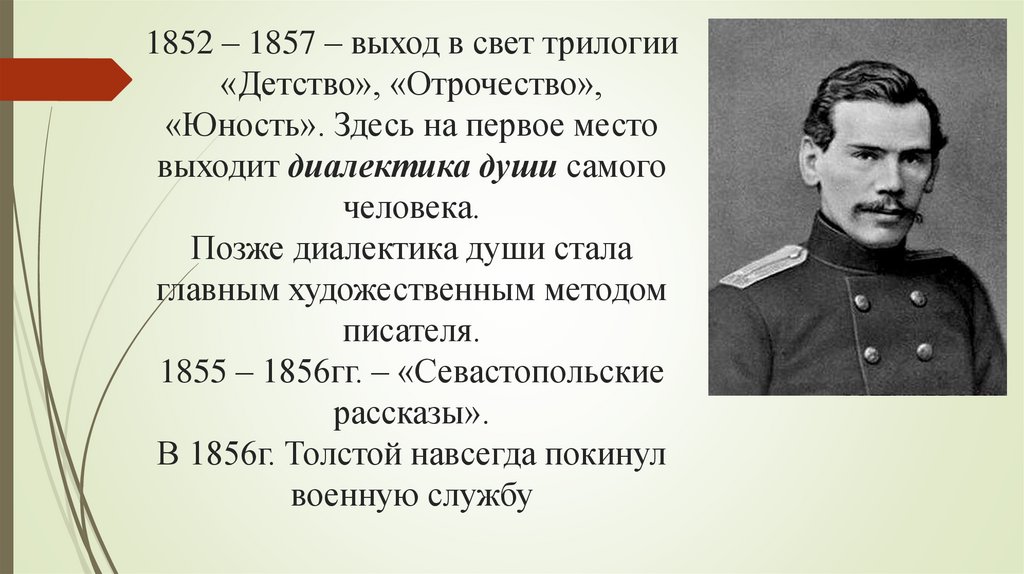 1852 – 1857 – выход в свет трилогии«Детство», «Отрочество»,