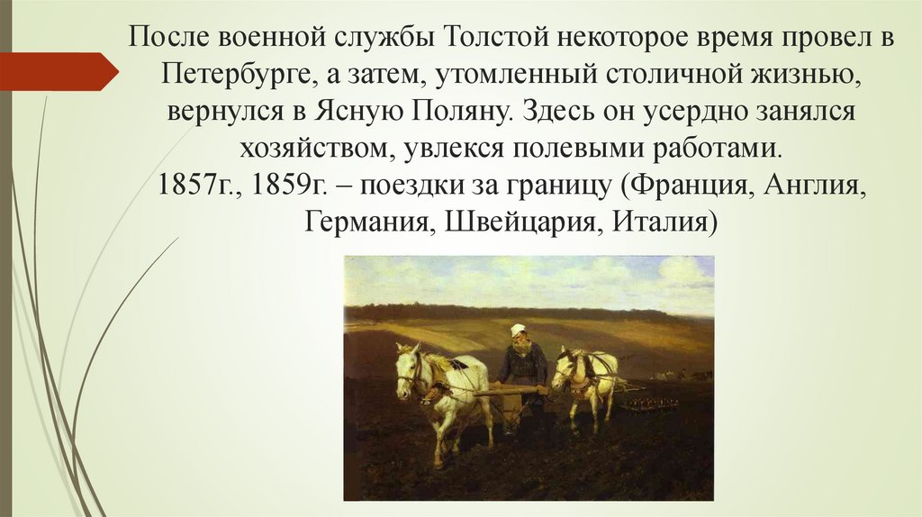 После военной службы Толстой некоторое время провел вПетербурге, а затем, утомленный столичной жизнью,