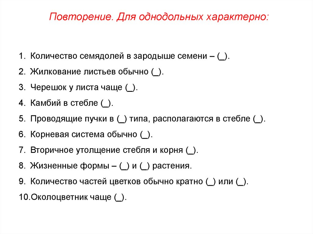 Повторение. Для однодольных характерно:1. Количество семядолей в зародыше семени – (_).