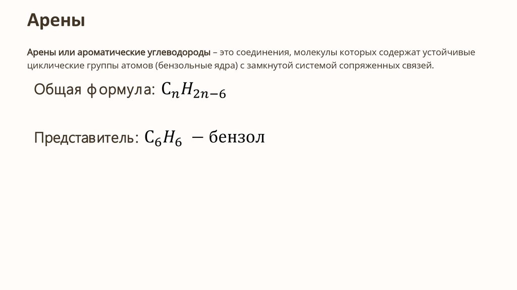 Арены или ароматические углеводороды – это соединения, молекулы которых содержат устойчивые