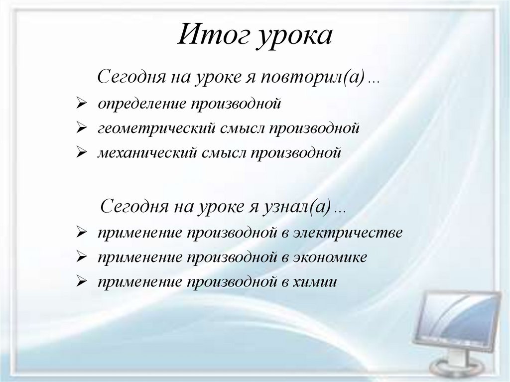 Итог урокаСегодня на уроке я повторил(а)…