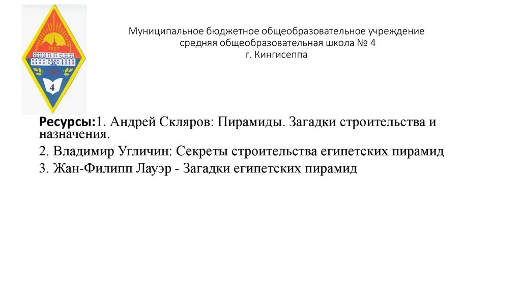 Ресурсы:1. Андрей Скляров: Пирамиды. Загадки строительства и