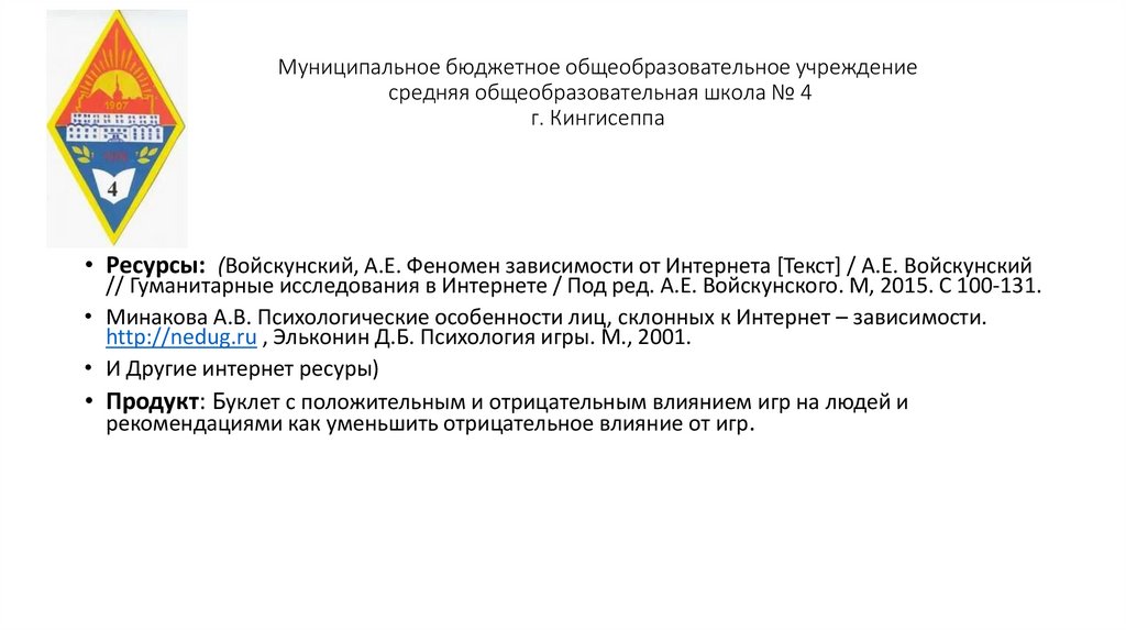 • Ресурсы: (Войскунский, А.Е. Феномен зависимости от Интернета [Текст] / А.Е. Войскунский