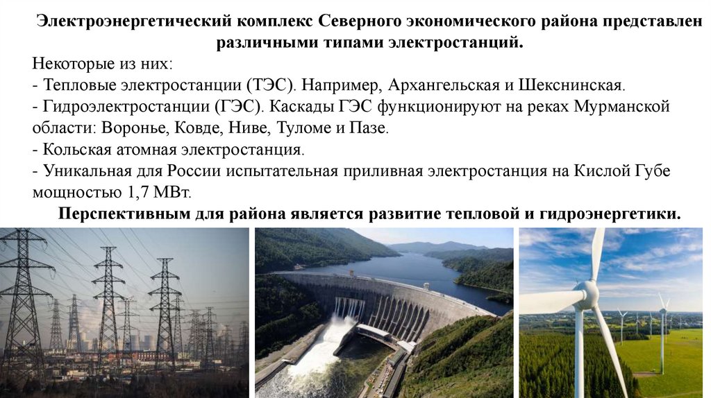 Электроэнергетический комплекс Северного экономического района представленразличными типами электростанций.
